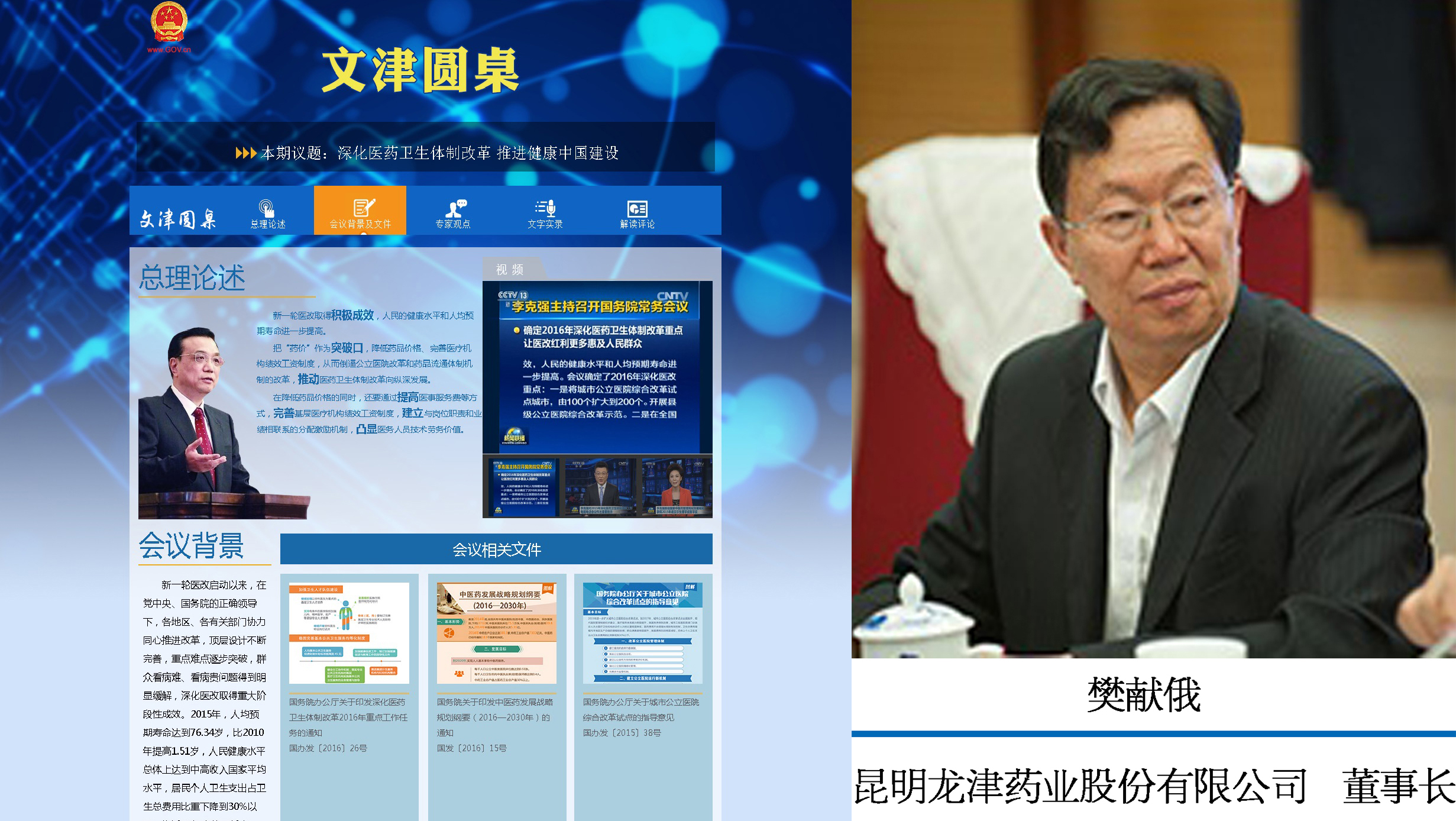 昆明龍津藥業(yè)股份有限公司董事長樊獻(xiàn)俄參加中國政府網(wǎng)2016年05月26日舉行的閉門圓桌會(huì)議并闡述了“藥品質(zhì)量及監(jiān)管”的精辟觀點(diǎn)。
