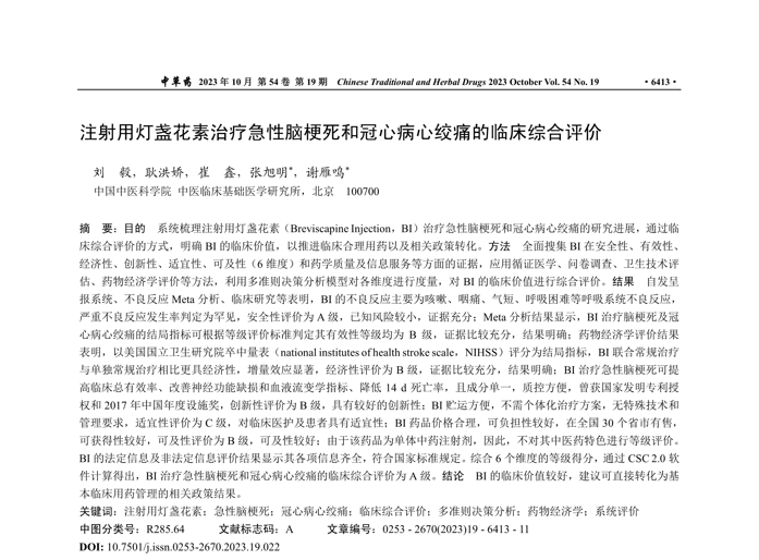 題目:注射用燈盞花素治療急性腦梗死和冠心病心絞痛的臨床綜合評價(jià)劉毅,耿洪嬌,崔鑫,張旭明*,謝雁鳴*中國中醫(yī)科學(xué)院中醫(yī)臨床基礎(chǔ)醫(yī)學(xué)研究所,北京100700摘要:目的系統(tǒng)梳理注射用燈盞花素(BreviscapineInjection,BI)治...