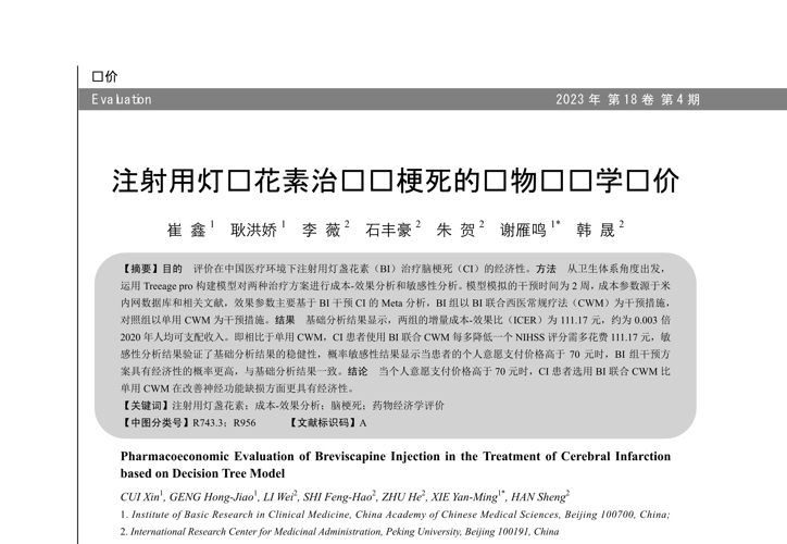 題目:注射用燈盞花素治療腦梗死的藥物經(jīng)濟(jì)學(xué)評價(jià)崔鑫1耿洪嬌1李薇2石豐豪2朱賀2謝雁鳴1*韓晟21.中國中醫(yī)科學(xué)院中醫(yī)臨床基礎(chǔ)醫(yī)學(xué)研究所,北京100700;2.北京大學(xué)醫(yī)藥管理國際研究中心,北京100191